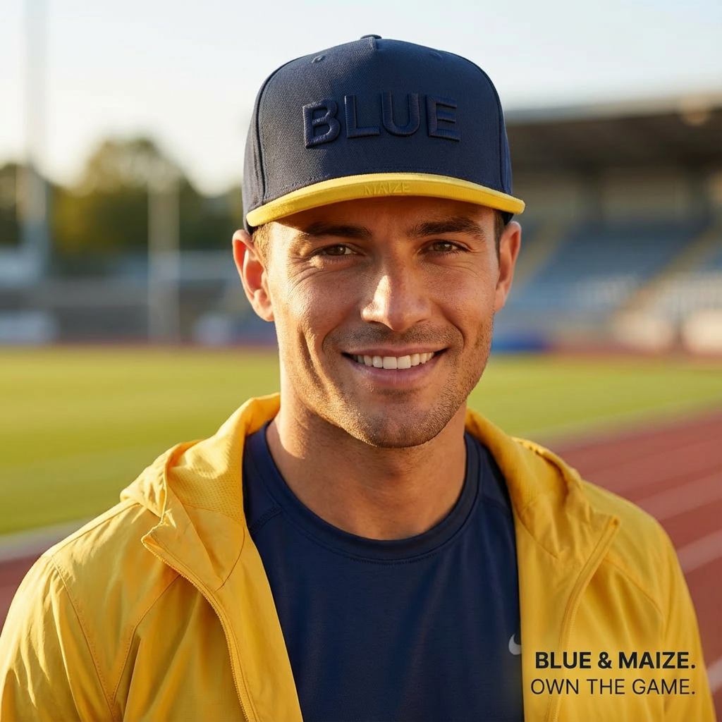 Big "BLUE" in 3D Embroidery. "MAIZE" stitched on the brim edge.
