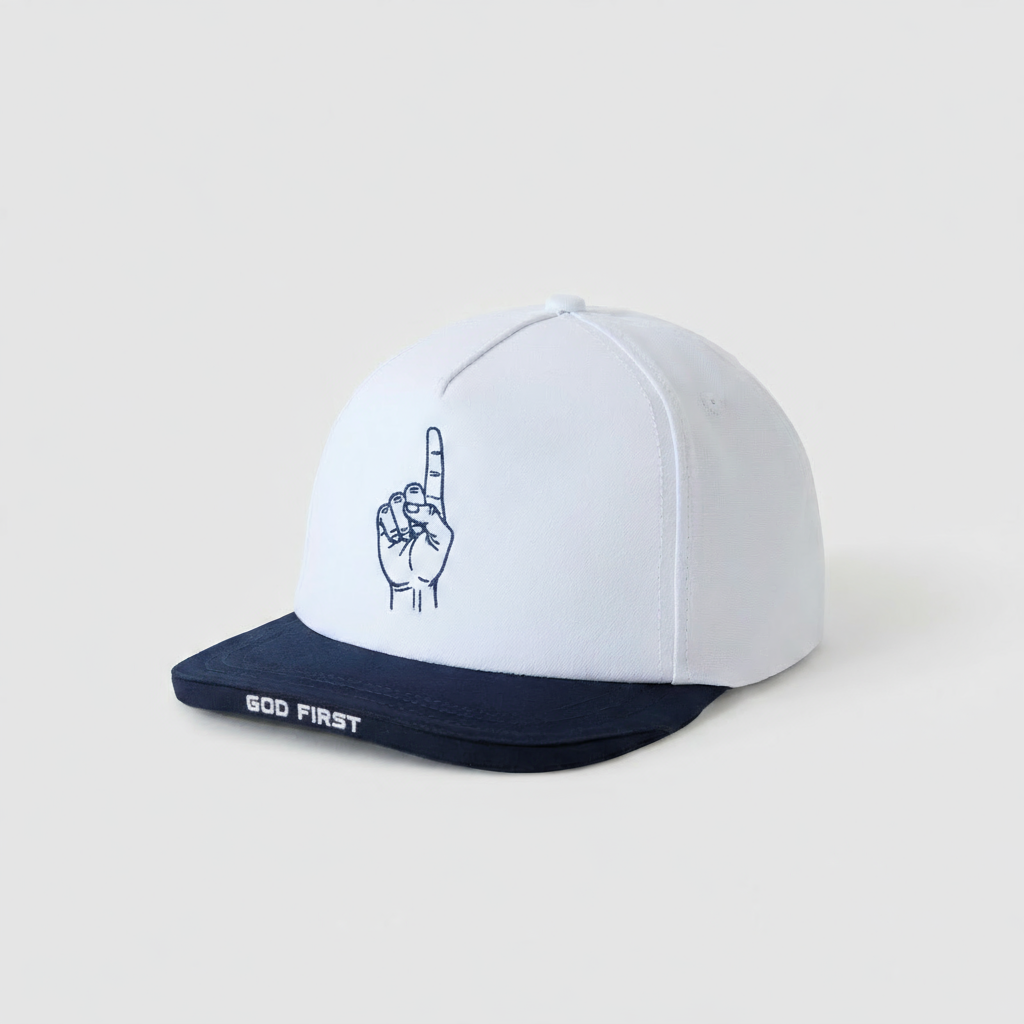 Brim Edge: “GOD FIRST” stitched in bold block font